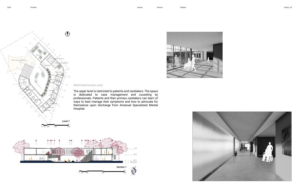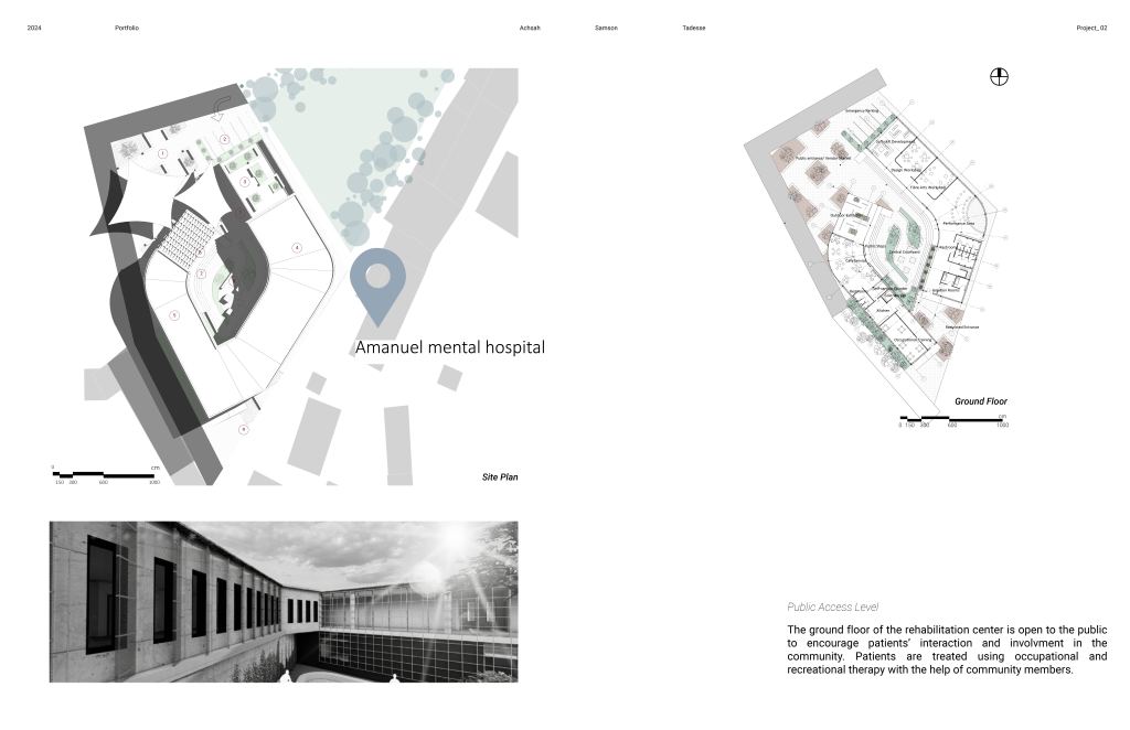 This social impact architectural project aims to decrease stigma around mental health by spatially integrating the existing specialized metal hospital with the surrounding overall site seamlessly and meaningfully. The project is designed to serve as a transitional space, allowing community members to engage with patients and gives patients the opportunity to slowly acclimate with the realities of social life after hospitalization.